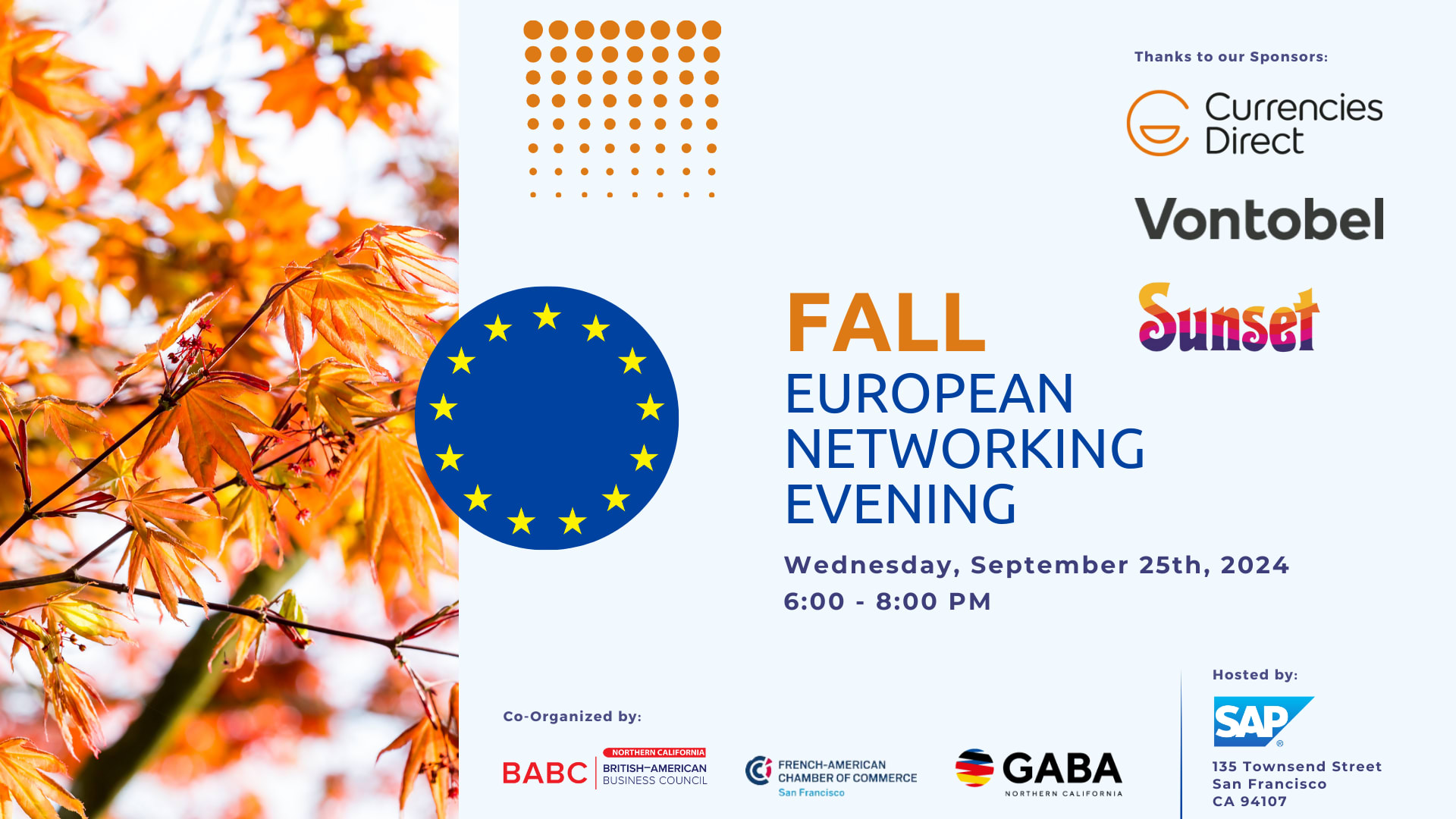 The German American Business Association of California, British American Business Council Northern California, and French American Chamber of Commerce San Francisco, in cooperation with many European Chambers of Commerce, invite you to join us for another wonderful European Networking Evening.