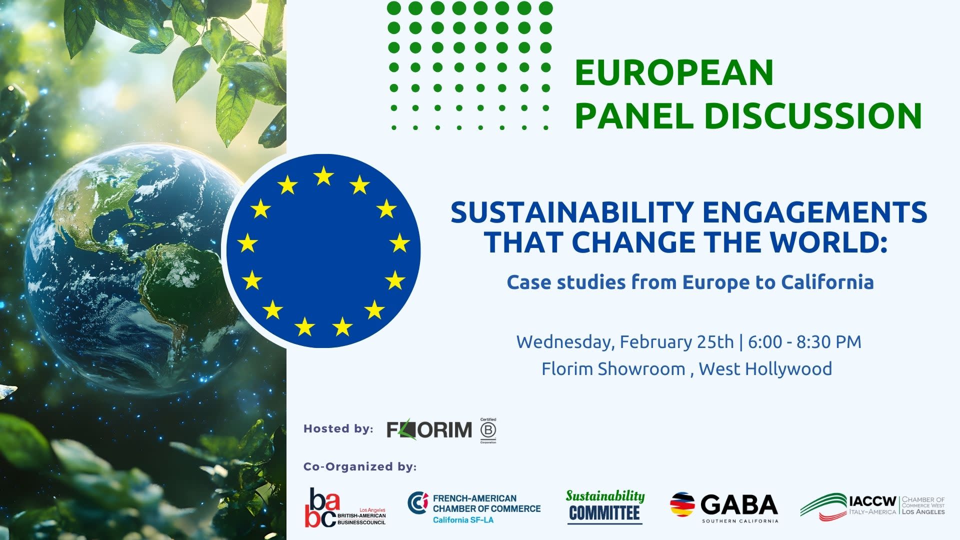 Come join the German American Business Association Southern California (GABA SoCal), in partnership with our European Chamber of Commerce Partners (FACC LA, BABC LA, IACCW), for an exclusive evening of impactful dialogue and networking, showcasing case studies of Sustainable Engagements that Change the World from Europe to California.