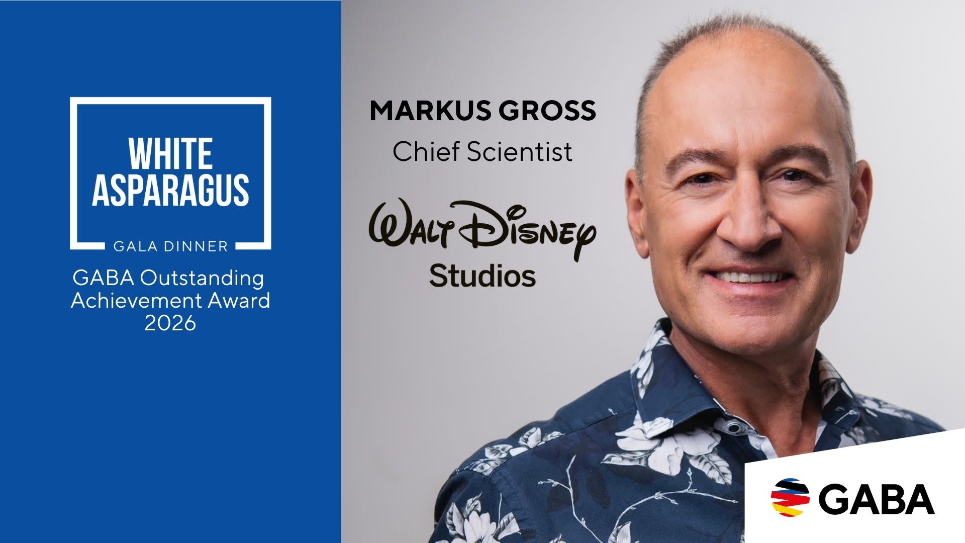 As a highlight of the evening, GABA Southern California is proud to present the 2026 GABA Outstanding Achievement Award to Markus Gross, Chief Scientist of The Walt Disney Studios. An internationally recognized leader in artificial intelligence, machine learning, visual computing, and immersive experiences, Markus also serves as a Professor of Computer Science at the ETH Zurich. His groundbreaking contributions to the film industry have been recognized with two Technical Achievement Awards from the Academy of Motion Picture Arts and Sciences.